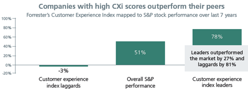 In a study done by PWC found that “52 percent of consumers would pay more for greater speed and efficiency; 43 percent would pay more for greater convenience”, Also Forrester recently Mapped Customer Experience Index (CXi) with Stock Performance, which clearly shows that leaders in CXi outperform competition. (Fig1)